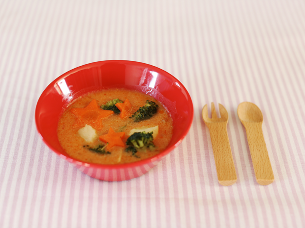 <1歳〜3歳のステップごはん> - 甘口カレーに明治ステップ らくらくキューブを加えて、小さなお子さまでも食べやすいカレーに。野菜もたくさん摂れるメニューです。