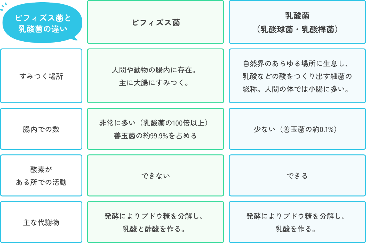 実は、ビフィズス菌と乳酸菌は違うもので、生息場所や、腸内での数、作り出すものも異なっています。