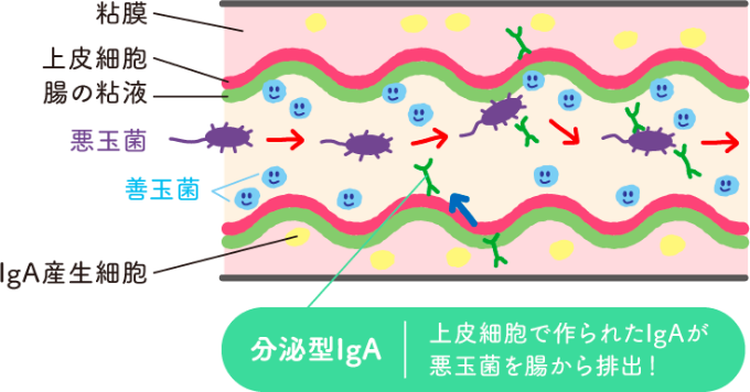 IgAは腸や口、乳腺などの粘膜にいる体をまもる抗体のことです。粘膜の表面でばい菌(悪玉菌)やウイルスにくっついて集めたり、毒の影響をなくしたりして、体内に入るのを防いでくれます。