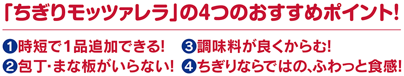 明治では、包丁などを使わずに手でモッツァレラをちぎって、手軽で簡単に楽しめる「ちぎりモッツァレラ」をご提案していきます。