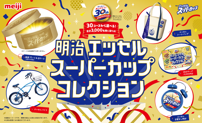 2024年11月1日より、オリジナルグッズなどが当たる「明治 エッセル スーパーカップ コレクション」キャンペーンを実施します。当キャンペーンは「明治 エッセル スーパーカップ」発売30周年にちなんで“30”のコースから選べる、合計3,000名様に豪華賞品が当たるキャンペーンです。「純金プレート」や「エッセルバイク」などの豪華賞品の他、「QUOカード」や「お菓子詰め合わせ」など身近なものまで幅広くご用意しています。