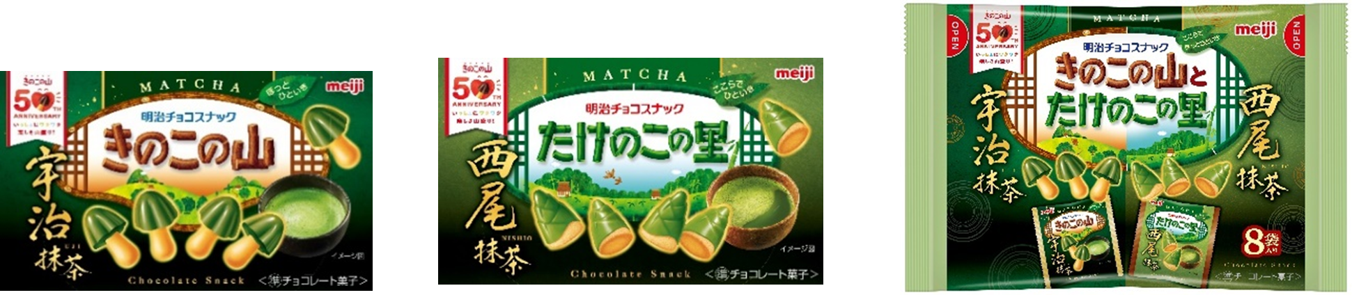 「きのこの山宇治抹茶」(64g)、「たけのこの里西尾抹茶」(61g)、「きのこの山とたけのこの里宇治抹茶西尾抹茶」(92g)
