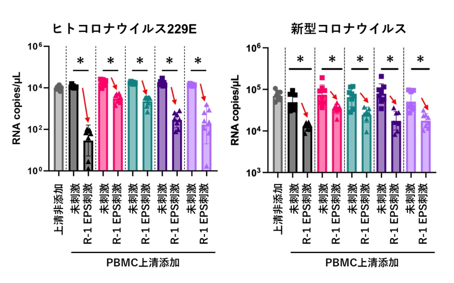 1. R-1 EPSで刺激したヒト末梢血単核細胞※3(以下、PBMC)の培養液をヒト肺由来培養細胞に加えて培養することで、ヒトコロナウイルス229E※4および新型コロナウイルスの増殖が抑制されました。