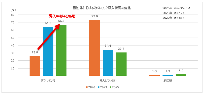 近年、南海トラフ地震臨時情報の発表や能登半島地震をはじめ、地震や豪雨などの大規模災害が相次ぐ中、災害時における乳幼児やその家族への支援体制の重要性があらためて注目されていることから本調査を実施しました。その結果、購入による備蓄に加え、流通備蓄※1や災害協定※2など、災害時の乳幼児の生活を支える物資を多様な形で確保・活用しようとする自治体の取り組みが広がっていることが明らかになりました。なかでも液体ミルクの導入率は、2020年の25.8%から66.8%へと大きく伸長しており、調乳不要で使いやすい点が評価され、乳幼児向け防災備蓄として実際に購入・備蓄する自治体が増加していることがうかがえます。