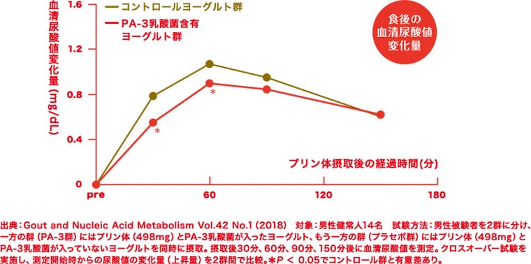 その結果、乳酸菌PA-3株を含むヨーグルトを摂取していた時は乳酸菌PA-3株を含まないヨーグルトを摂取していた時と比べ、食後の血清尿酸値の上昇が抑制されていることが分かりました。