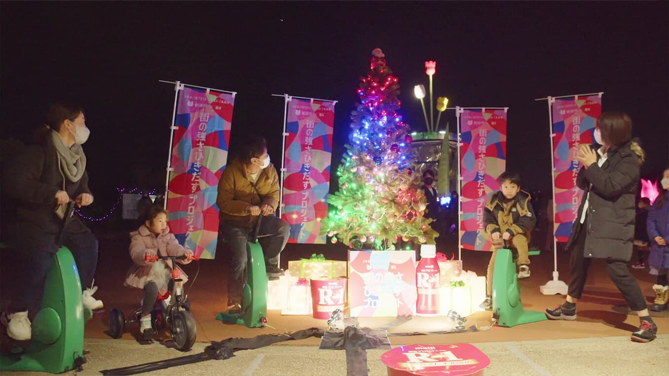 今回の目玉体験は、自転車のペダルを漕いでイルミネーションを灯す「健康発電クリスマスツリー」です。ツリーの周りには子ども用を含めた4台の自転車を用意し、本プロジェクト発足のきっかけにもなる「1073」の数字にちなんで発電量107.3Wを目指します。発電が始まるとプレゼントボックスやツリーの照明が点灯し、最後にツリーの頂点にあるサンタクロースが灯る仕組みになっています。体験を盛り上げるクリスマスの曲が流れ、周りにいる人が手拍子をする中、どのグループもペダルを必死に漕ぎ続け、サンタクロースを光らせていました。参加した人は「楽しかったけれど、思い切りやったので想像以上に疲れました」と口を揃え、普段の運動不足を実感する機会になったようです。