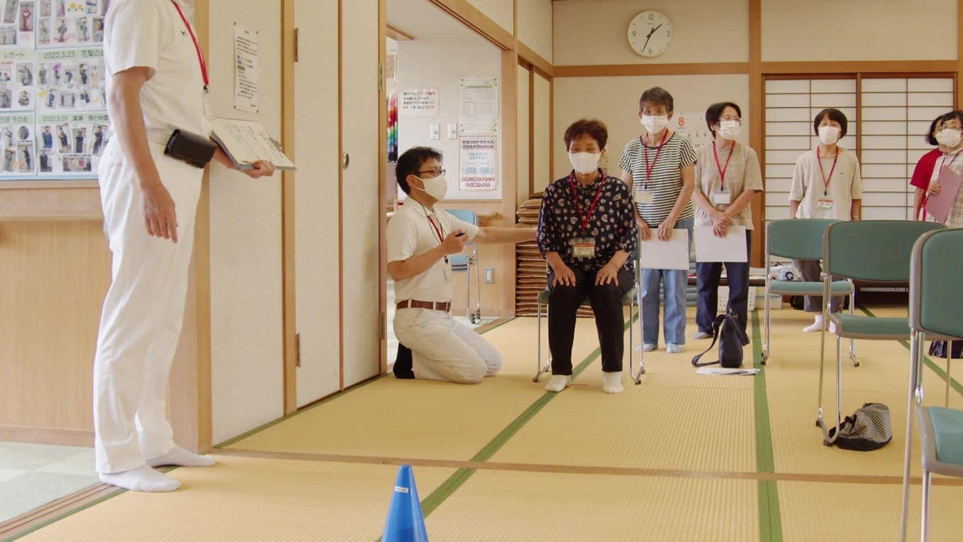 体操を終えた後は、R-1で水分と栄養補給をしながら健康セミナーのDVDを鑑賞。残暑の厳しい季節に役立つ熱中症対策の後編で、水分不足が起こる原因について学びました。高齢者が水分不足になるのは、年齢的な理由と日ごろの行動が関わっているそうです。食べものを飲み込む嚥下機能が低下することでの食事量の低下、トイレが近くなることを理由に水分を控えること、喉の渇きや暑さを感じにくいなどの様々な原因があります。また高血圧や心不全の治療薬は、薬に利尿作用があることが多く尿が増えることも水分不足の理由になっています。 水分不足かどうかのセルフチェック方法があります。左手の甲を親指と人差し指で引き上げて山を作り、指を離したときに約3秒しても皮膚が戻らなければ水分不足が疑われます。ほかにも体温や脈拍の上昇、血圧の低下、手足の冷え、体重の減少なども水分不足のサイン。そして毎日確認できるのが尿の色です。水分不足の場合、尿の色は濃くなるそうです。 水分が失われると、立ちくらみやめまい、頭痛、足がつるなどの症状が出ます。症状が出たときは熱中症の場合があるので、涼しい場所で休憩して水分補給をしましょう。また汗をかいたら水分とミネラルを必ず補給してください。体調が悪いときや睡眠不足のときは体の機能が低下して熱中症のリスクが高まります。食事を抜くのも水分不足につながるので気をつけてください。