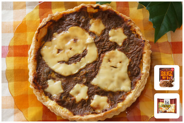 (2)の生地に(1)をのせ、銀座カリー中辛をかける。スライスチーズは好みの型に切ってのせ、オーブンを180℃に下げてさらに10~15分ほど焼く。