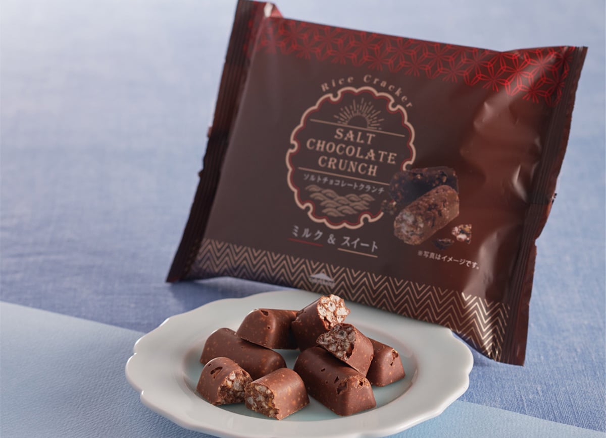 おかきのザクザクッとした食感とチョコレートの甘みの中にまろやかな塩味がふわりと広がる、新感覚クランチチョコレートです。