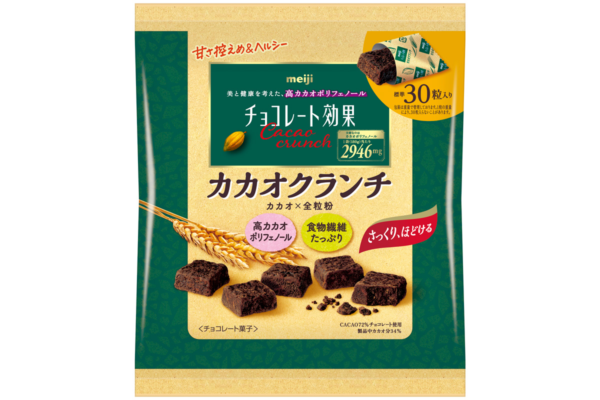 「チョコレート効果 カカオクランチ」は、カカオ分72%の本格的なビターチョコレートに、砕いた全粒粉の焼き菓子を組み合わせたクランチチョコです。サクッとほどけるソフトなクランチ食感が特徴。健康志向とクランチ食感の楽しさを兼ね備えた新しいチョコスナックです。
