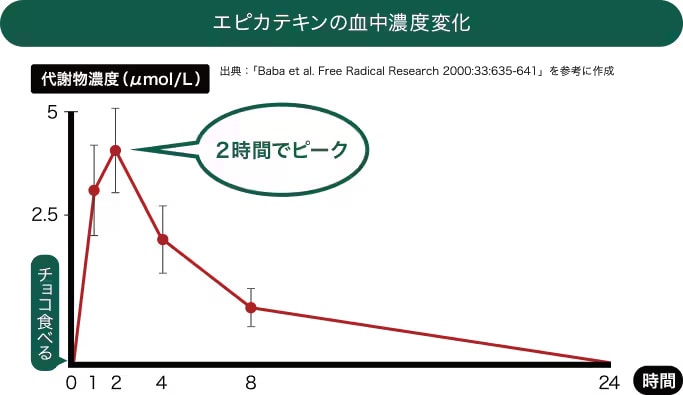 カカオポリフェノールの主成分である「エピカテキン」について血中濃度の変化を調べたところ、摂取してから2時間後に血中濃度がピークに達し、徐々に対外へ排出され24時間後にはほとんどなくなることが分かりました。そのため、カカオポリフェノールが多く含まれる高カカオチョコレートを1日数回にわけて、食べるのがおすすめです。