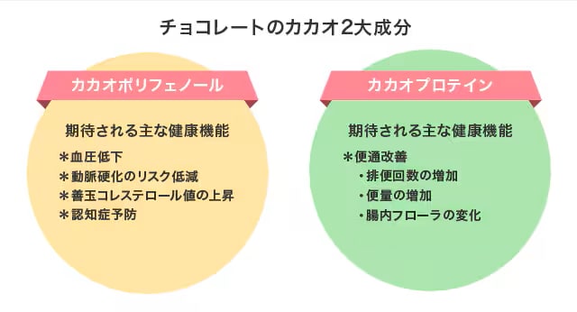 カカオプロテインに期待される主な健康機能としては便通の改善があり、排便回数の増加、便量の増加、腸内フローラが変化し腸内環境を整える作用をもたらすと考えられています。