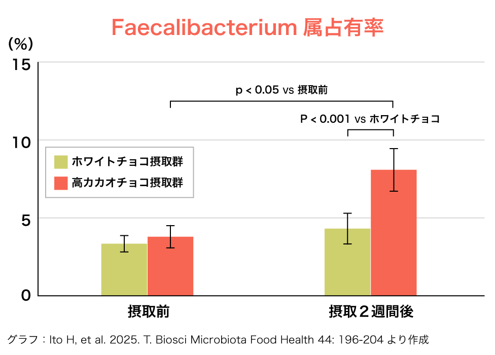 【高カカオチョコレートの継続摂取でフィーカリバクテリウムが有意に増加】