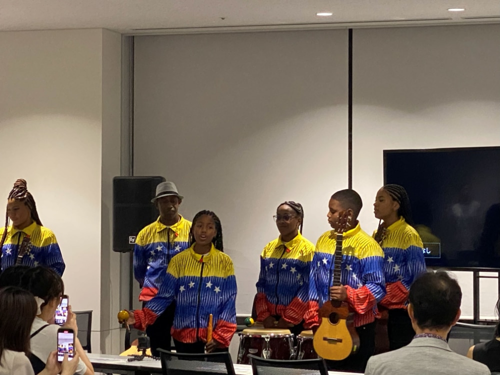 そして、もうひとつの目玉はベネズエラ・チュアオ村から来日した、7人の子どもたちによる音楽生演奏。チュアオ村といえば、品質の高いカカオで知られる有名なカカオ産地です。同村では、カカオを育てたり収穫したりカカオと向き合う時、感謝の意を込めて⾳楽を奏でる⽂化があるとのこと。主催者の立花商店では、気候変動やカカオの品質向上のため、カカオ栽培⽂化の保護も重要な課題で、消費者がチョコレートを楽しみ続けるためにも、カカオにまつわる⽂化を⽇本に伝える、理解・保護することも⼤事だと考え、今回の企画に繋がったそうです。