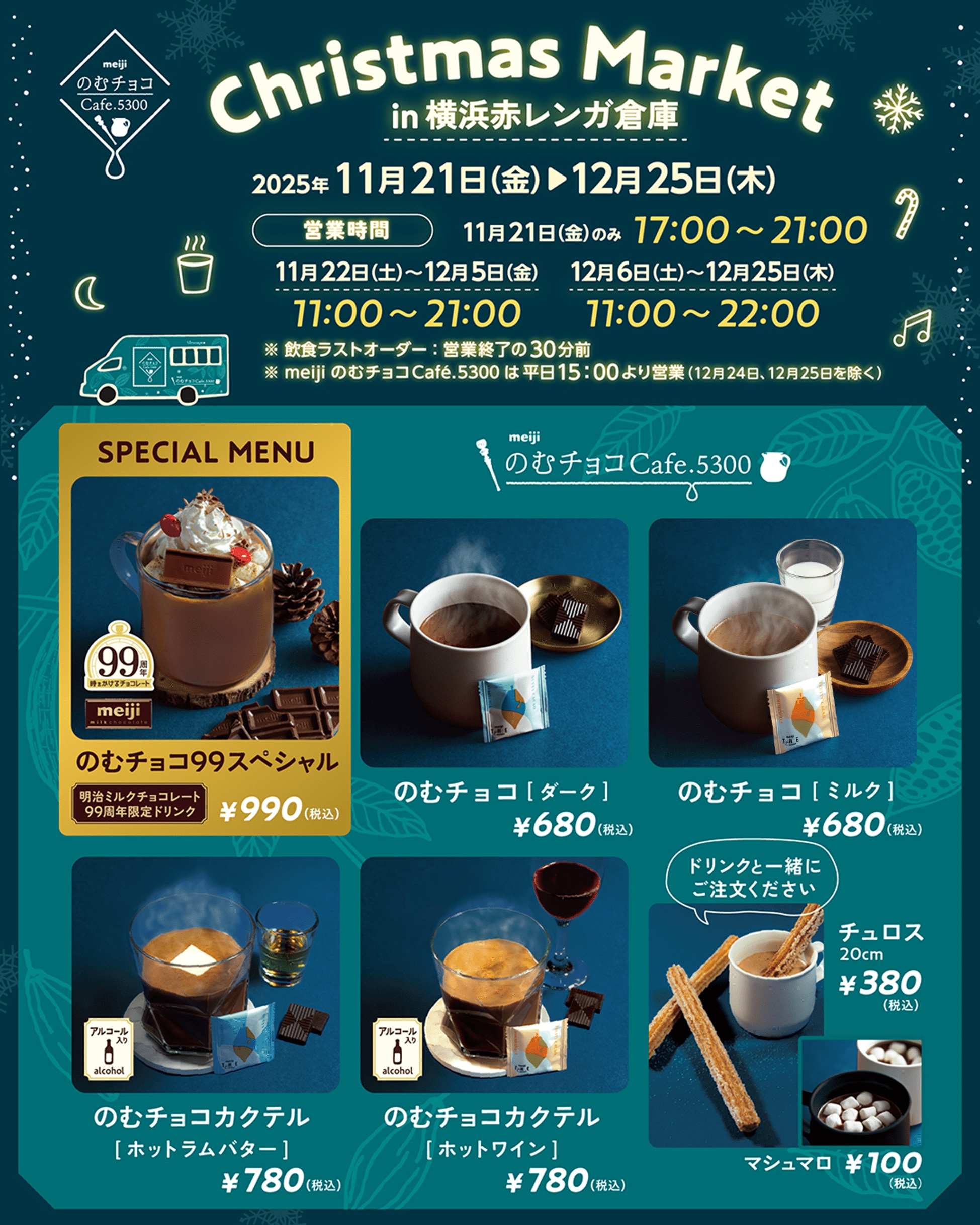寒い夜に、キラキラ光るツリーを見ながら飲むのむチョコは格別。チョコレートの需要期が始まるホリデーシーズンにぴったりな心温まるメニューをご用意して、今年はChristmas Market in 横浜赤レンガでお待ちしています。(Christmas Market in 横浜赤レンガへの出店は今年で2回目、クリスマスマーケットへは3年連続の出店になります。)