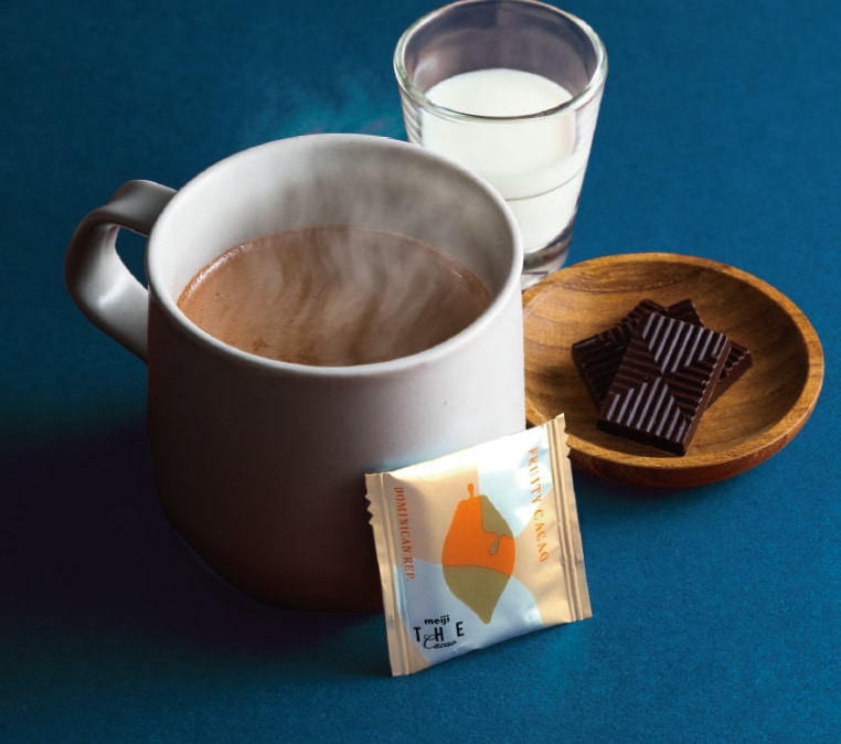 ミルクのやさしい甘さで引き立つカカオの香りとキャラメルのようなコク。ドミニカ共和国産カカオのフルーティカカオを使ったドライフルーツのような華やかさも。大人向けの、甘さ控えめののむチョコです。