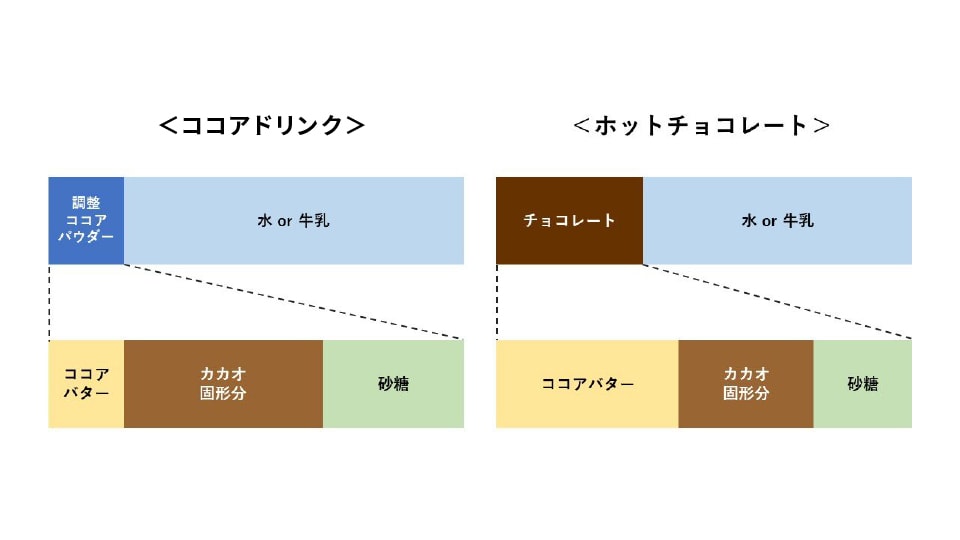 ホットチョコレートはチョコレートに牛乳や水を加えて作る飲み物です。一方、ココアドリンクは、ココアパウダー(カカオ豆をすりつぶしたカカオマスからココアバターという脂肪分を除いた固形分)に牛乳や水、砂糖を加えて作ります。(下図はイメージです)