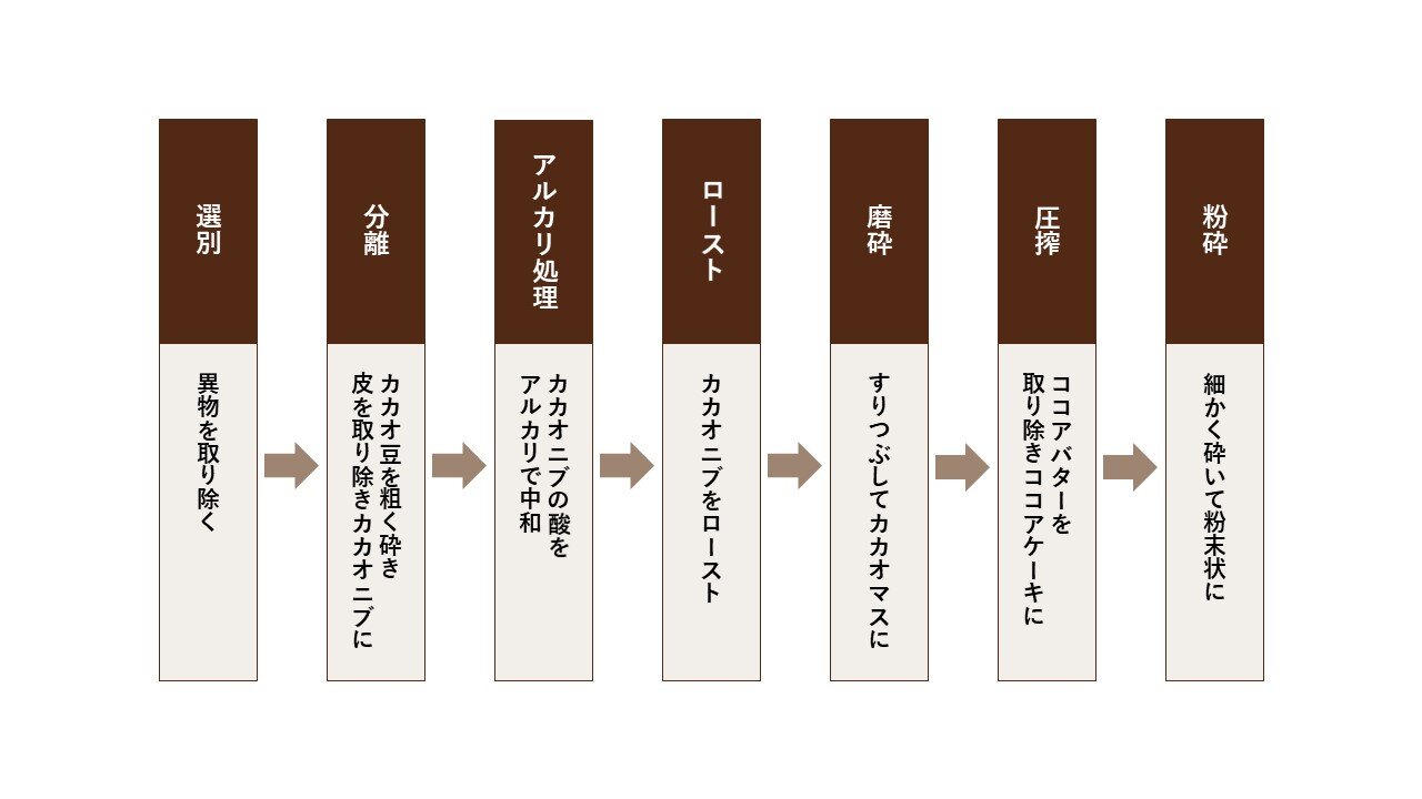 また、圧搾(ココアバターの分離)工程では、カカオマスに圧力をかけ、ココアバターを絞り出します。元々カカオ豆に55%ほどあるココアバターが8~24%ほどになります。残った固形状のものはココアケーキと呼ばれ、それを細かく粉砕したものがココアパウダーです。これらの工程により、湯などとの混合が容易になります。