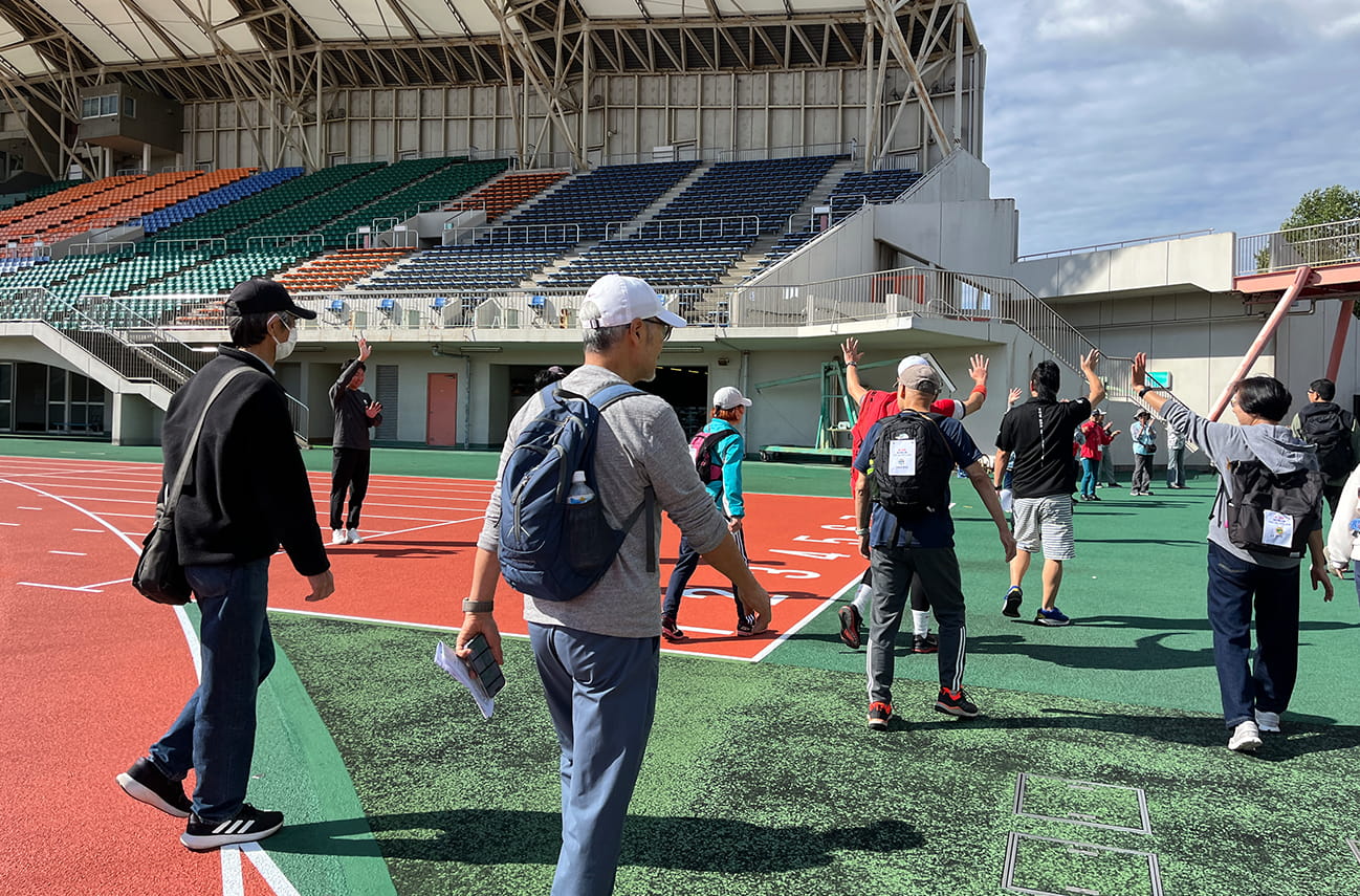 競技場のトラックを一周したのち、腕を大きく振って柏の葉の街へ出発していく参加者の皆さん、背中からもやる気が溢れているようです。