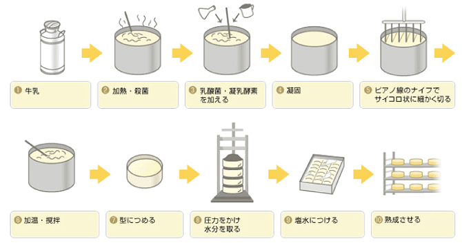 一般的なナチュラルチーズの作り方を紹介します。牛乳を加熱殺菌した後「乳酸菌」と「酵素」を加えると、牛乳中のたんぱく質や脂肪、カルシウムなどが豆腐状に固まります。これをサイコロ状に細かく切って温めながら撹拌。型に入れて圧力をかけ「乳清(ホエイ)」と呼ばれる余分な水分を取ります。さらに風味をつけて雑菌の繁殖を抑えるために塩水につけます。その後、熟成させると(※1)チーズのできあがりです。