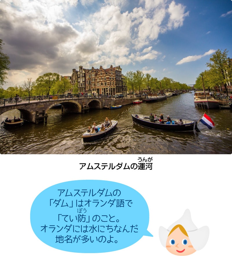 平たんな地形のオランダは、国土の約45%が農用地という農業大国。農作物の輸出額ではアメリカに次いで世界で2番目です。日本では温室さいばいというとビニールハウスですが、オランダは最先たんの技術を取り入れたガラス張りの温室「グラスハウス」で、野菜などたくさんの作物をさいばいしています。