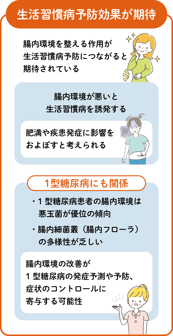 近年、自己免疫疾患と考えられている1型糖尿病についても、その発症に腸内細菌が関わることが明らかになってきました。1型糖尿病患者の腸内環境は2型糖尿病患者と同じく悪玉菌が優位の傾向にあり、また成長過程で多様化するはずの腸内細菌叢(腸内フローラ)においても、1型糖尿病患者の場合はその多様性が乏しいことも判明しています。このことから腸内環境の改善が1型糖尿病の発症予測や予防、症状のコントロールに寄与する可能性が示唆されています*13。