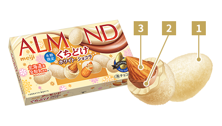 用散發芳醇牛奶香氣的入口即化雙層白巧克力及巧克力,包裹住香濃杏仁的明治杏仁可可球。具有能感受到牛奶的濃醇和風味的高品質。