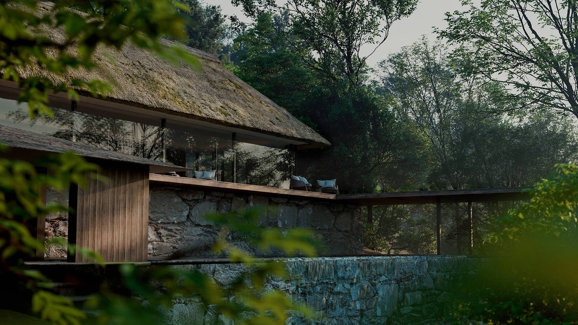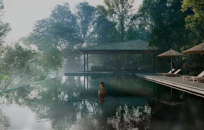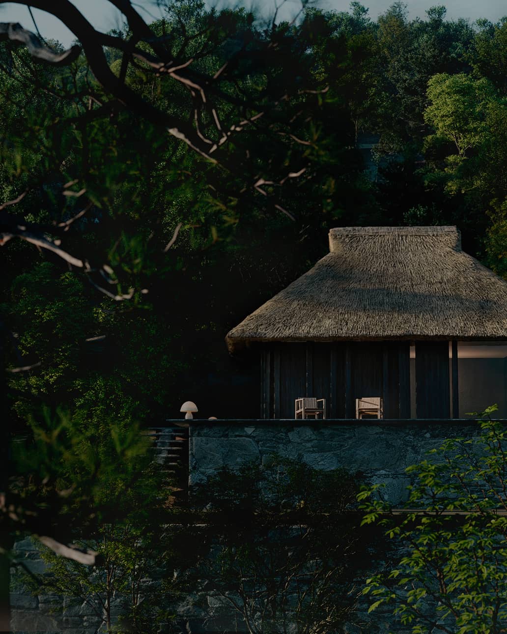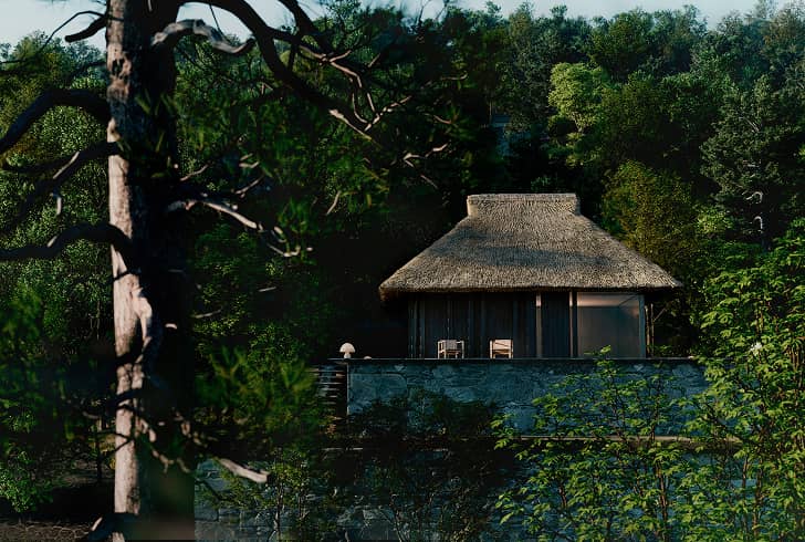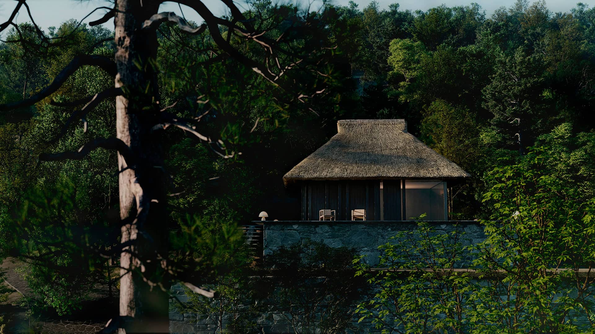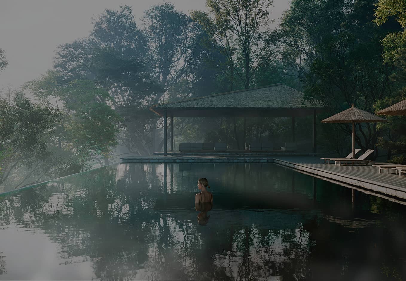 森の深淵に佇むプールや小屋は、