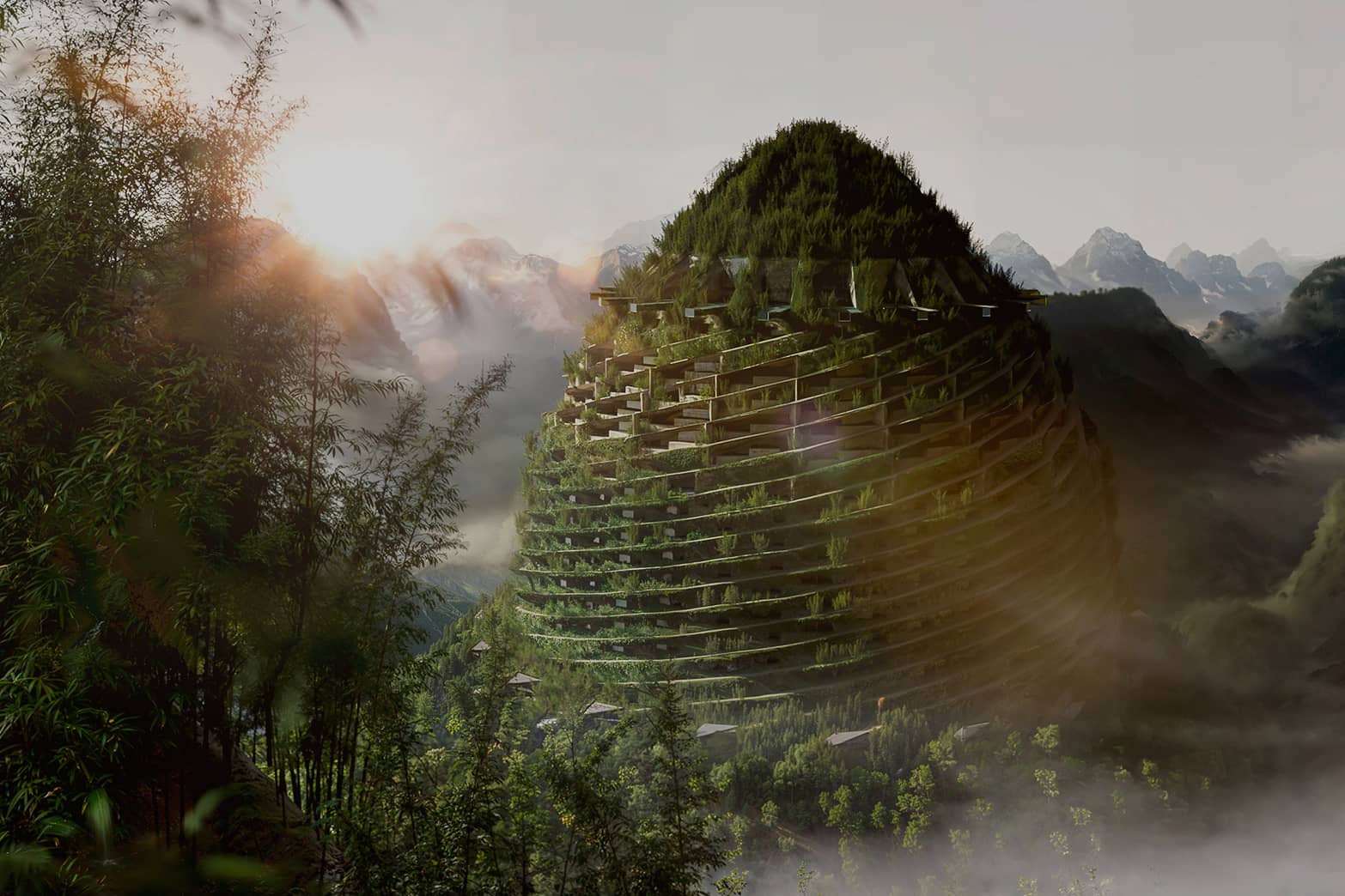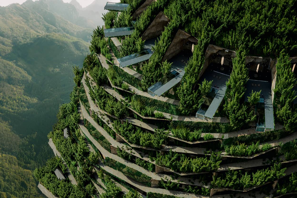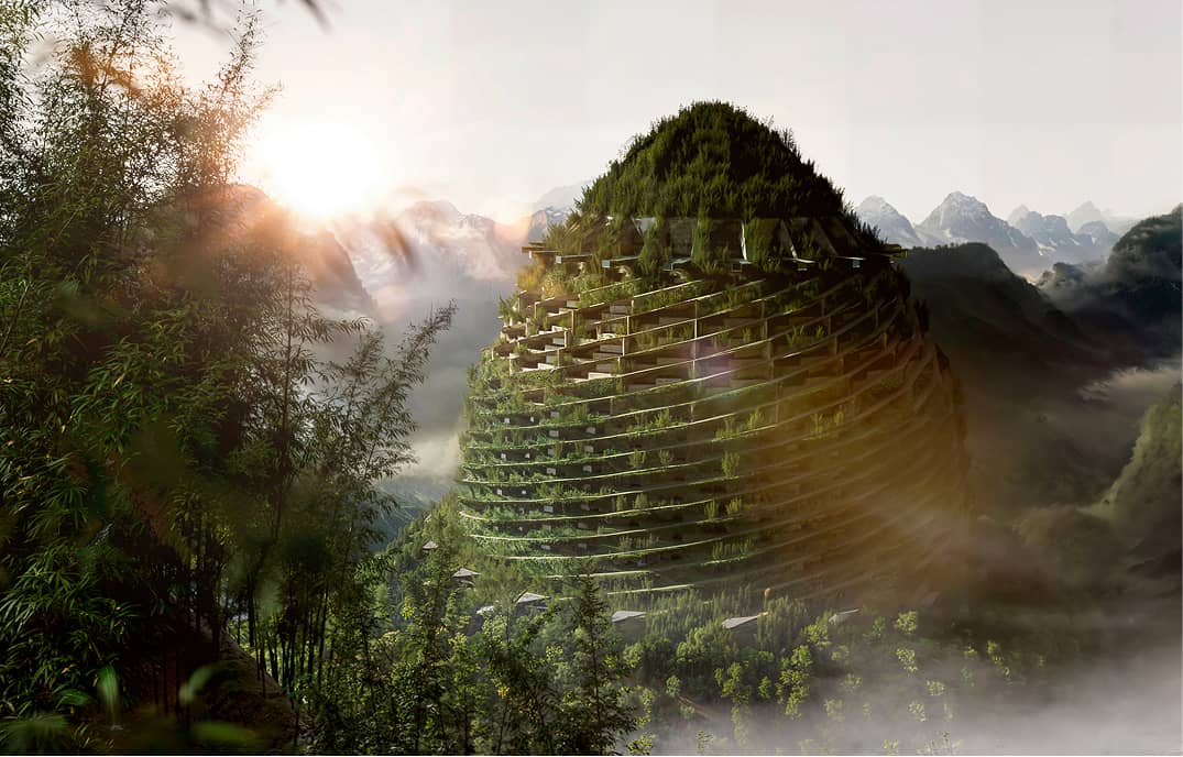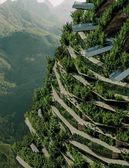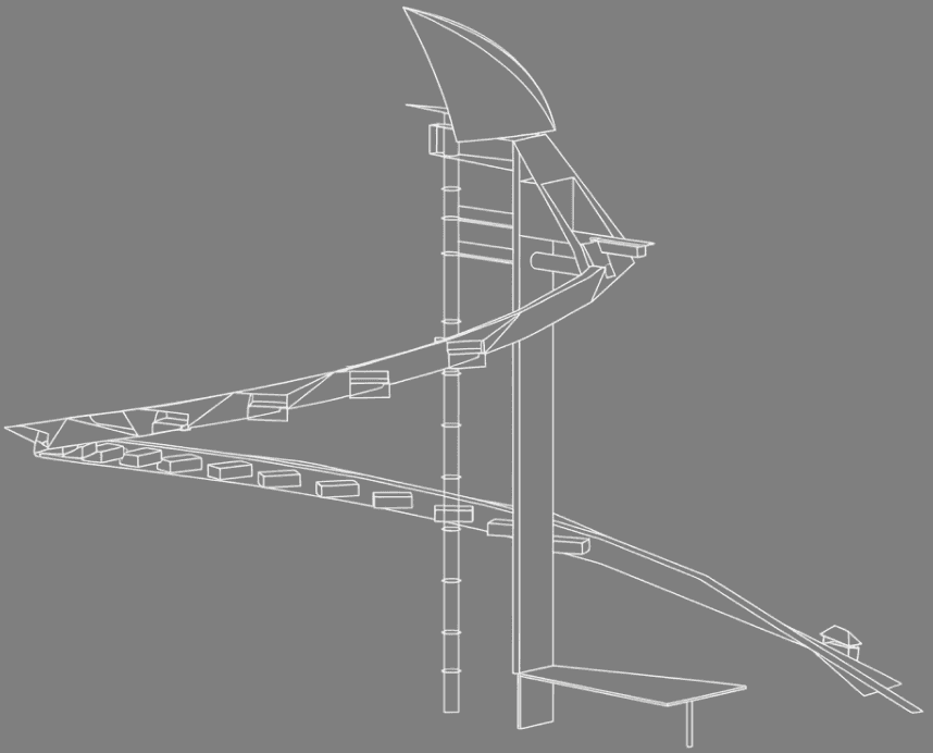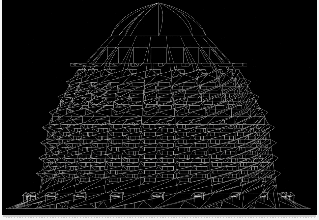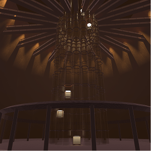 再現した天空へと伸びる建築。