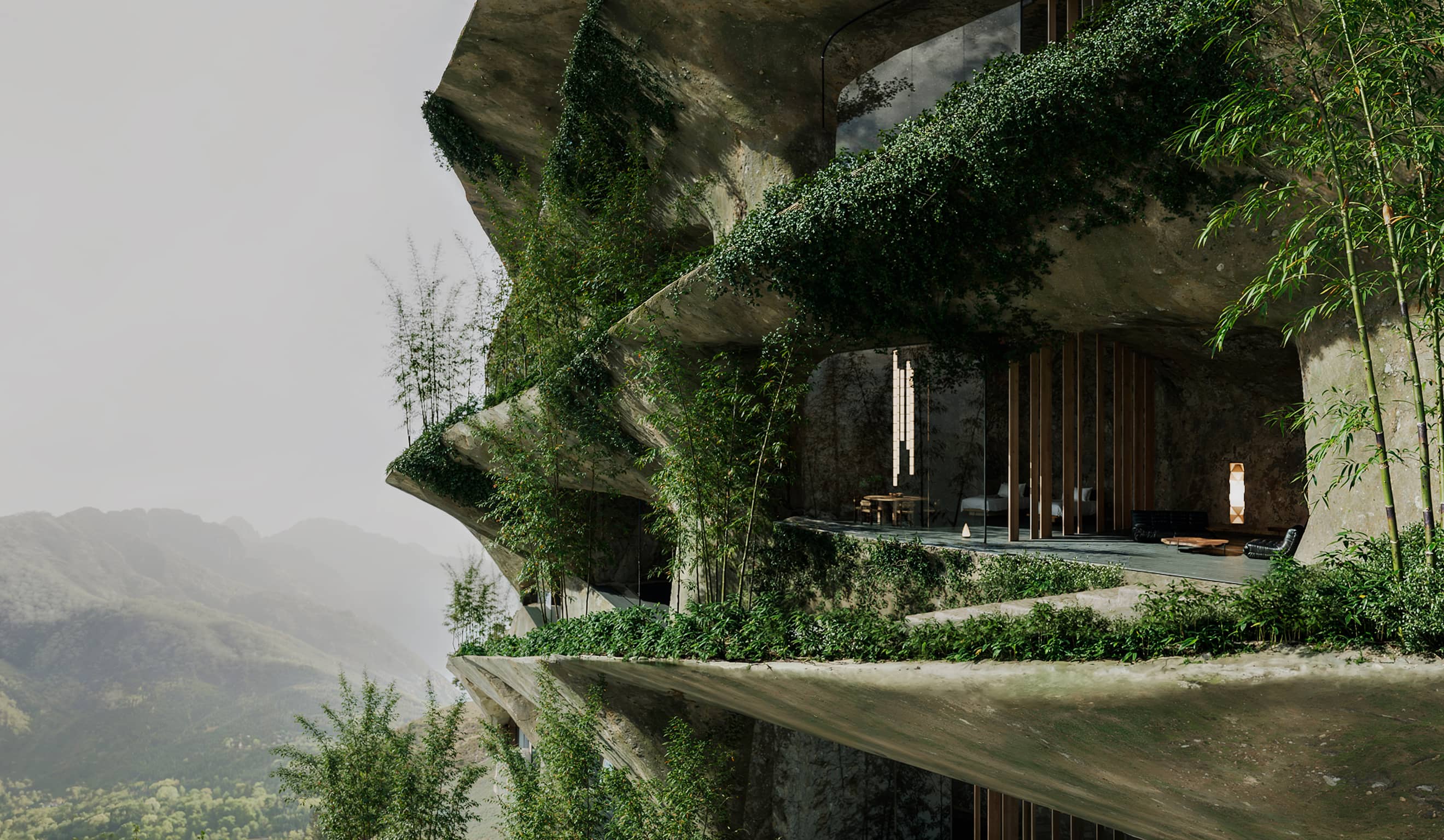 眼下の絶景と共鳴するシームレスな空間は、