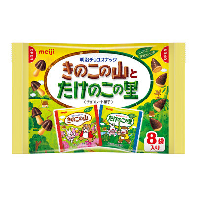| 原材料名 | <きのこの山> 植物油脂(国内製造)、小麦粉、乳糖、砂糖、全粉乳、ココアバター、練乳パウダー、ショートニング、まっ茶、異性化液糖、麦芽エキス、食塩、イースト/乳化剤、膨脹剤、クチナシ色素、香料、酸化防止剤(ローズマリー抽出物)、(一部に小麦・乳成分・大豆を含む) <たけのこの里> 砂糖(国内製造)、小麦粉、植物油脂、乳糖、ショートニング、液卵、全粉乳、ココアバター、練乳パウダー、卵白、マーガリン、まっ茶、アーモンドペースト、食塩、麦芽エキス/乳化剤、膨脹剤、クチナシ色素、香料、酸化防止剤(ローズマリー抽出物)、(一部に小麦・卵・乳成分・アーモンド・大豆・マカダミアナッツを含む) |