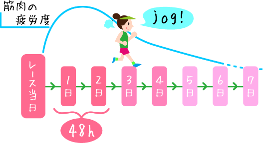 10km、ハーフのレースは非常に体力を消耗しますが、レース3日後くらいに軽いジョギングを入れると筋肉痛からの回復が早まります。筋肉の炎症は48時間までがピークといわれており、それ以降は軽く走るほうが、血流が促進され疲労物質の排出が進むのです。ただし、人によって筋肉痛の出方が違うので、自分の身体をよく知って、トレーニングサイクルに生かしてください。
