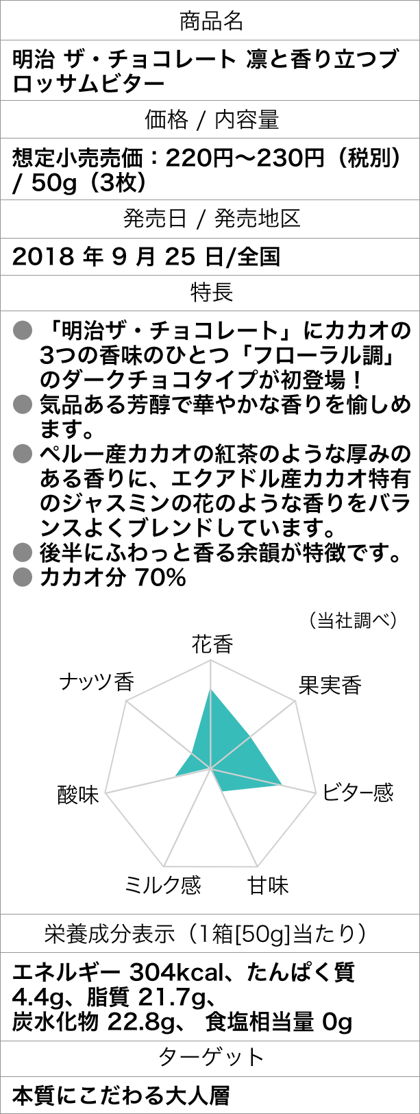 「明治 ザ・チョコレート 凛と香り立つブロッサムビター」は、ペルー産カカオの紅茶のような厚みのある香りに、エクアドル産カカオ特有のジャスミンの花のような香りをバランスよくブレンドしました。