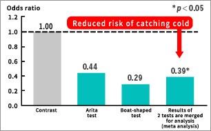 A study was conducted in 57 healthy seniors (69–80 years old) living in Funagatamachi, Yamagata Prefecture, and 85 healthy seniors (59–84 years old) living in Aritacho, Saga Prefecture, in order to investigate the effects of lactic acid bacteria on the immune system. Each of these regional subject pools was divided into two groups. One group consumed 90 g of yogurt containing 1073R-1 lactic acid bacteria per day. The other group consumed 100 ml of milk per day. The subjects in Funagatamachi and Aritacho were kept on this dietary regimen for 8 and 12 weeks, respectively, then changes in their physical conditions and immunity were compared. For both regions, the groups consuming yogurt containing 1073R-1 lactic acid bacteria had a significant*1 increase in the ability to produce T cells, which tends to decline with age. Furthermore, in the groups consuming the yogurt in both regions, subjects with low NK activity before the consumption experienced a significant increase in NK activity. In addition, the risk of catching the common cold was reduced in the yogurt-consuming groups. If the risk of catching the common cold in the milk-consuming group is 1, the risks in the groups consuming yogurt containing 1073R-1 lactic acid bacteria in Aritacho and in Funagatamachi were 0.44 and 0.29, respectively. With these two risks combined for analysis, the weighted average risk is 0.39, indicating a significant reduction in the risk of catching the common cold.