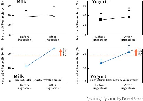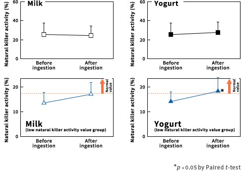 Yogurt containing 1073R-1 lactic acid bacteria enhanced NK activity and reduced the risk of catching the common cold.