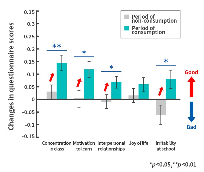 This study was a non-consumption-controlled crossover study involving 2,179 boys and girls attending 6 elementary schools in Hachioji City. The effects of consuming yogurt containing 1073R-1 lactic acid bacteria for 8 weeks on the number of days absent from school, motivation to learn, and interpersonal relationships were analyzed.
