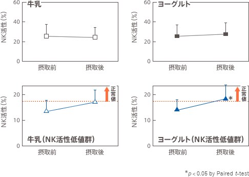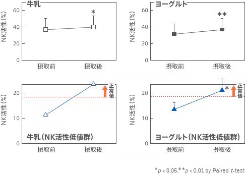 山形県舟形町に住む69~80歳の健康な高齢者57名と、佐賀県有田町に住む59~84歳の健康な高齢者85名を対象にして乳酸菌の免疫システムへの働きを調べました。どちらの地域も2つの群に分けて調査しました。一つは乳酸菌1073R-1株を含むヨーグルトを1日90g食べる群。もう一つは牛乳を1日100ml飲む群です。舟形町では8週間、有田町では12週間継続して食べてもらい、体調や免疫の変化を比較しました。すると、どちらの地域でも、乳酸菌1073R-1株を含むヨーグルトを食べた群では、加齢に伴い低下するT細胞増殖能が、有意(※1)に上昇しました。また、乳酸菌1073R-1株を含むヨーグルトを食べた群ではどちらの地域でも、食べる前にNK活性が低かったグループにおいて、その活性が有意に上昇しました。