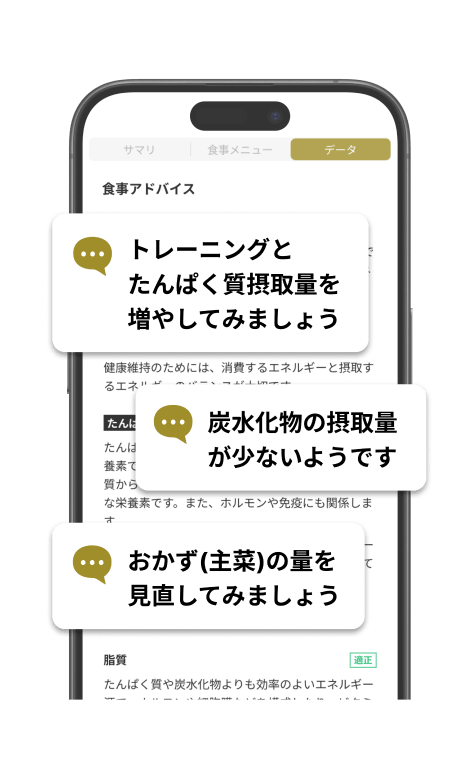 記録した食事のPFCバランスや摂取栄養素をグラフやチャートで確認。