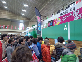(株)明治では、前日の受付会場にブースを出展し、『スーパーヴァーム顆粒』をはじめ、VAAM・ザバスをセットしたレース前・中・後をサポートする『明治ランナー応援セット』を販売しました。季節外れの寒気の影響で、河口湖付近の受付会場の外では34年ぶりの雪が降る中、明治ブースにはランナーの皆さんが次々に訪れました。