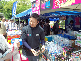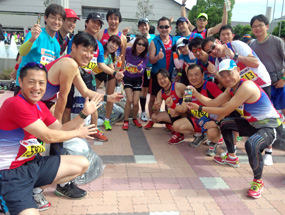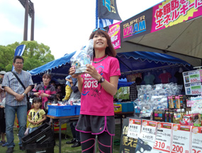 前日の18日(土)から行われた「楽市楽座(EXPO)」では、もちろん明治ブースに来て、"走る前にはスーパーヴァーム!"を力強くおすすめしてくれました。練習やレースで走る前だけでなく、給水も全てヴァームやスーパーヴァームだったQちゃんですが、ファンランで出場したレースでは、給水ボトルにヴァームゼリーをくっつけていたという使い方も披露。スーパーヴァーム顆粒やスーパーヴァームゼリーセットを買い求める行列ができました。そして最後はQちゃんを囲んで記念撮影!みなさん、とても良い笑顔ですね。