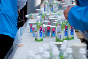 大会当日、沿道に用意された給水は「ヴァームウォータークリアアップル」。おいしくすっきり飲める味、そして汗で失われるナトリウムを強化した設計で水分補給をサポート。大変好評でした。お天気も良く、少し気温が高かった今大会は、水分補給がとても重要だったようです。そして、感動のフィニッシュ。待ち構えるのは、頑張ったカラダを素早くリカバリーするための「ザバスアクアプロテイン100」。レース直後にペットボトルの水に溶かして飲む光景がたくさん見られました。