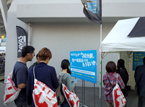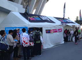 大会前日の明治ブースでは、レースに役立つクイズラリーと販売を実施。テントの外には行列ができました。「クイズ、おもしろかったです」と言いに来て下さる方もいらっしゃいました!