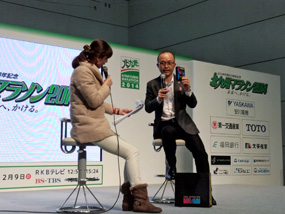 ステージでは「北九州出身のゲストランナー 金哲彦さん」によるトークショーが行われ、レースに向けたアドバイスを多くの参加者が聞き入っていました。その中で、金さんは走るときの必須アイテムとして自らも愛飲しているスーパーヴァームを紹介!トークショー終了後には、「金さんの言うとおりに飲んでみます」というランナーが押し寄せ、明治ブースはさらに賑わいました。