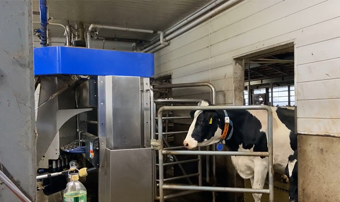 最新鋭の機械を取り入れた牛舎は、24時間自動で換気が行われ、温度や湿度を調整します。また、牛の首につけたタグで活動量を測定し、健康状態がいつでもタブレットで確認できるように見える化が徹底されています。