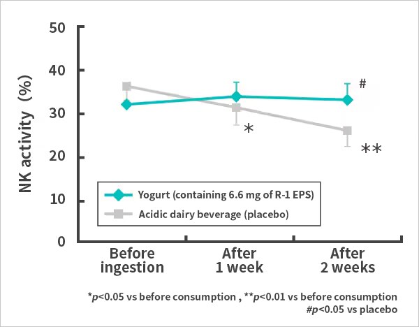Findings from 1073R-1 lactic acid bacteria research(6)Yogurt containing 1073R-1 lactic acid bacteria has been confirmed to potentially suppress the decline in immunity (NK activity) temporarily and maintain good physical conditions in subjects at high risk of immune dysfunction (human study conducted in male university track-and-field athletes (healthy individuals) aged 18 to 25 in 2012).This study demonstrated that it is effective in maintaining normal immune function even in people at high risk of weakened immune function. In addition, ingestion of group consuming yogurt containing 1073R-1 lactic acid bacteria is thought to be effective in maintaining systemic homeostasis and good physical condition through suppressing the temporary decline of intestinal function and the abnormal amino acid metabolism. This result was found for the first time thanks to the fact that 6.6 mg of R-1 EPS was ingested, twice as much as in previous studies. Risk of weakened immune functionDecline in immune function is thought to increase the risk of developing a variety of infectious diseases*1 and to be related to poor physical and psychological conditions*2. While there are various causes of the decline in immune function such as aging, it is also known that irregular lifestyles and strenuous exercise are risk factors. It is also reported that strenuous exercise may damage the intestinal tract and impair protein digestion and absorption*3. In order for athletes to stay in good physical condition, it is critical to maintain normal immune function and not to allow blood levels of essential amino acids to decrease, as these help repair post-training muscle damage*4.