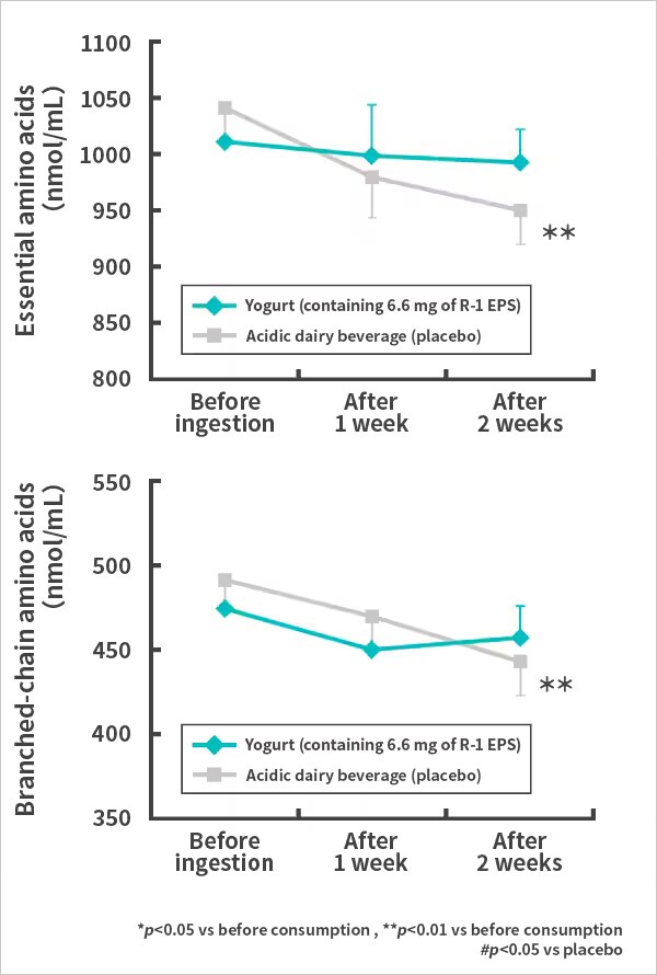 These results demonstrated that ingestion of group consuming yogurt containing 1073R-1 lactic acid bacteria (containing 6.6 mg of R-1 EPS) suppressed the temporary decline in immune function induced by strenuous exercise. In addition, ingestion of the yogurt is expected to suppress the decline in intestinal function induced by strenuous exercise and maintain normal blood levels of amino acids, helping to maintain good physical condition. |