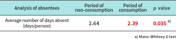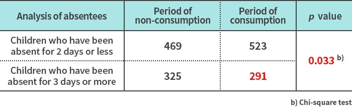 Findings from 1073R-1 lactic acid bacteria research(7)Yogurt containing 1073R-1 lactic acid bacteria has been confirmed to reduce school absenteeism and improve learning motivation in elementary school students (human study conducted in boys and girls attending 6 elementary schools in Hachioji City, Tokyo, from 2022 to 2023).This study was a non-consumption-controlled crossover study involving 2,179 boys and girls attending 6 elementary schools in Hachioji City. The effects of consuming yogurt containing 1073R-1 lactic acid bacteria for 8 weeks on the number of days absent from school, motivation to learn, and interpersonal relationships were analyzed. The results suggested that consuming yogurt containing 1073R-1 lactic acid bacteria may reduce symptoms in students who are absent from school.Average number of days absent (total)