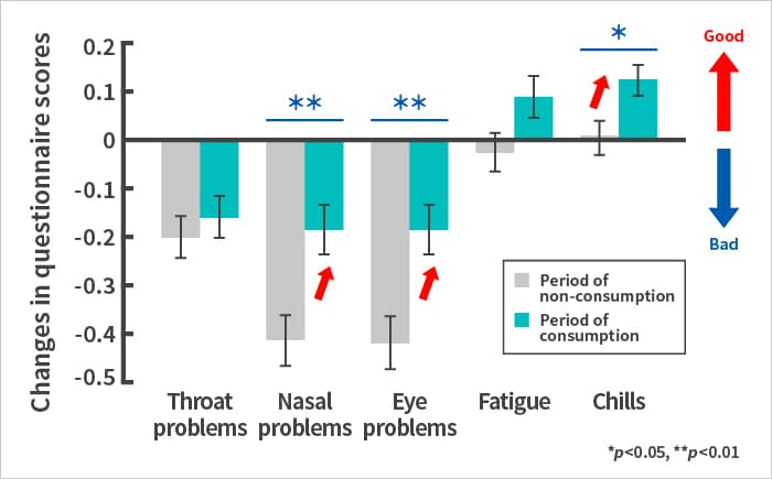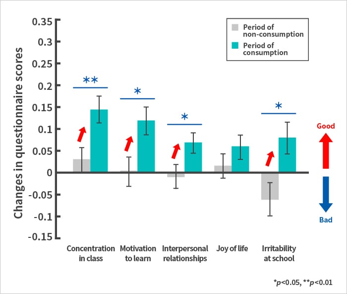 Consumption of yogurt containing 1073R-1 lactic acid bacteria significantly improved nasal and eye problems and chills.Results of questionnaire on physical conditions ![]() Consumption of yogurt containing 1073R-1 lactic acid bacteria significantly improved concentration in class, motivation to learn, interpersonal relationships, and irritability at school.Results of questionnaire on physical conditions ![]()