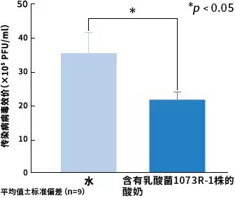 在与北里大学的共同研究中,进行了使小鼠感染甲型流感(H1N1)病毒的实验。从感染前21天至感染后4天期间,给小鼠喂食含有乳酸菌1073R-1株的酸奶,并与喂食水的小鼠组进行对照观察。